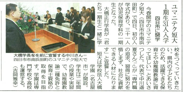 4月4日(火)に放送された三重テレビ「ニュースウィズ」、4月5日(水)の中日新聞およびタウン情報誌「Youよっかいち」フェイスブックに入学式の様子が取り上げられました。