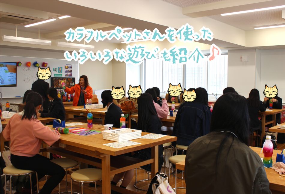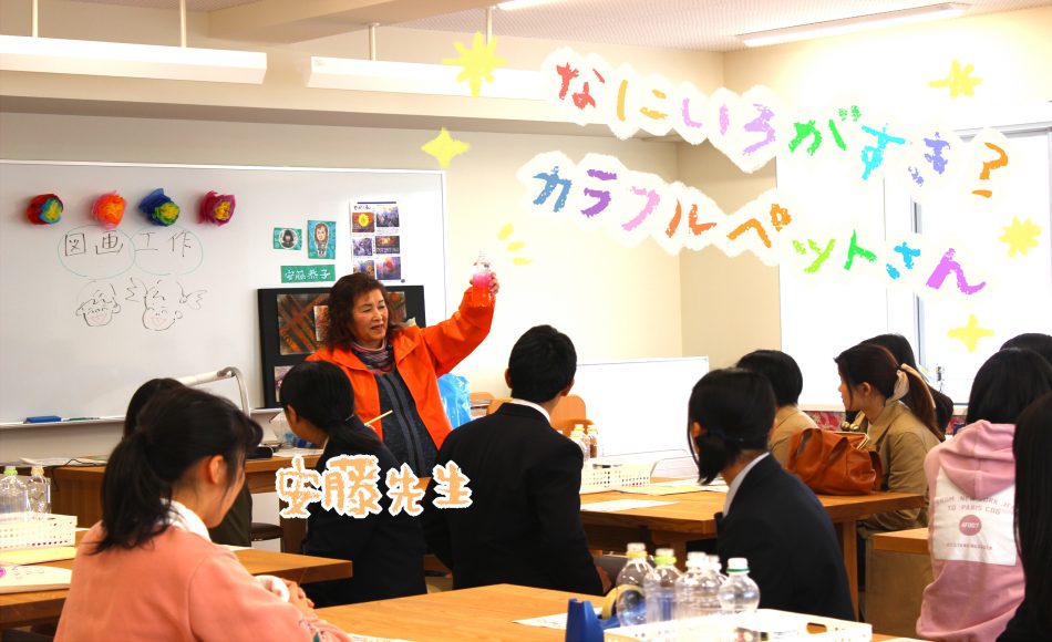 今回の体験授業は、安藤恭子先生による『なにいろがすき?カラフルペットさん』でした。