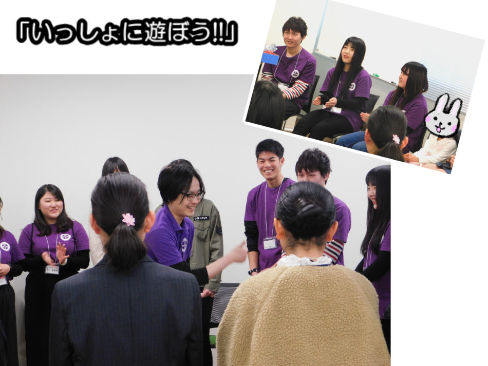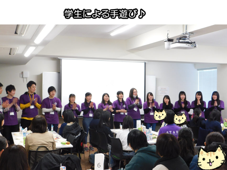 参加者の方たちに喜んでいただくため、学生たちが事前に練習した手遊びやパネルシアター、エプロンシアターの披露も行いました。