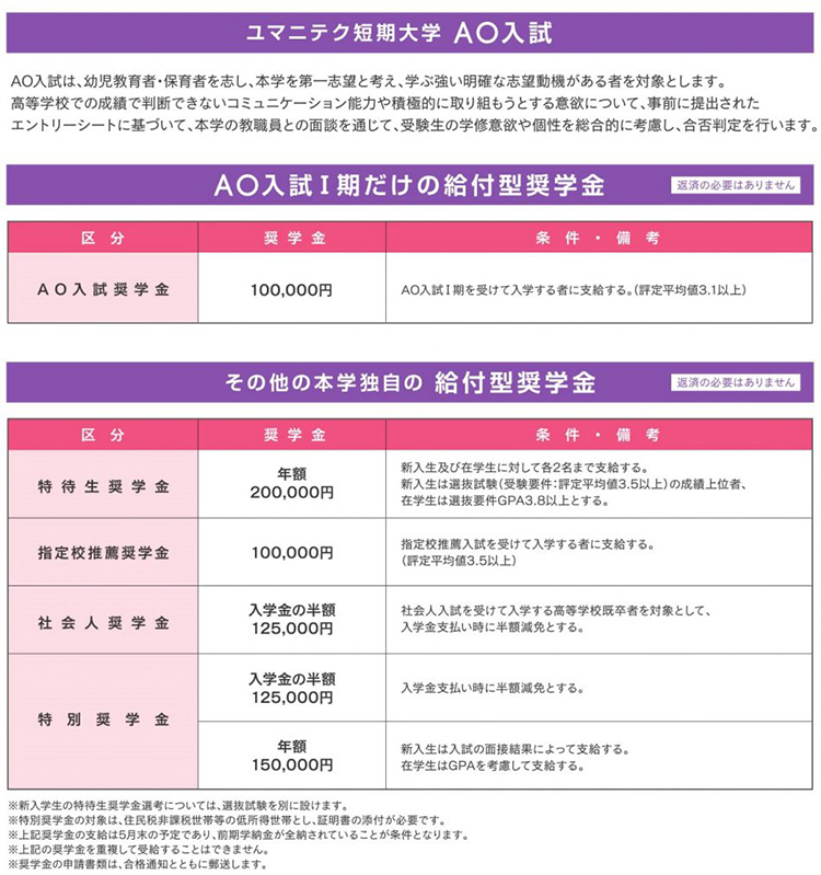 奨学金制度の詳細については、ユマニテク短期大学オープンキャンパスにてご説明いたします。